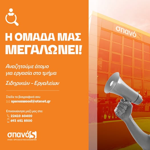 Ζητείται πωλητής στο τμήμα σιδηρικών & εργαλείων στο κατάστημα ''ΞΥΛΕΙΑ ΣΠΑΝΟΣ''
