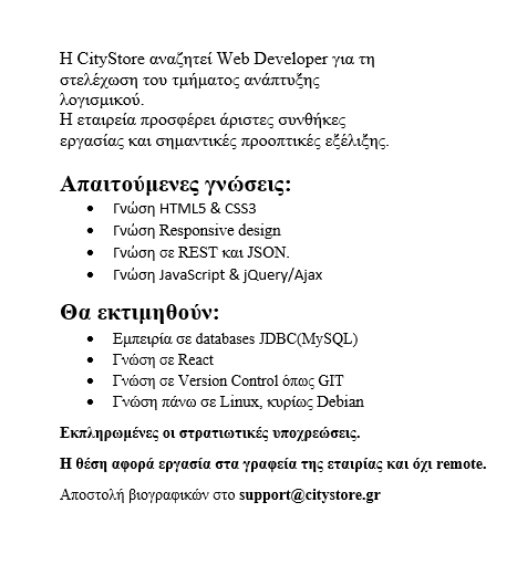 Η CityStore αναζητεί Web Developer για τη στελέχωση του τμήματος ανάπτυξης λογισμικού